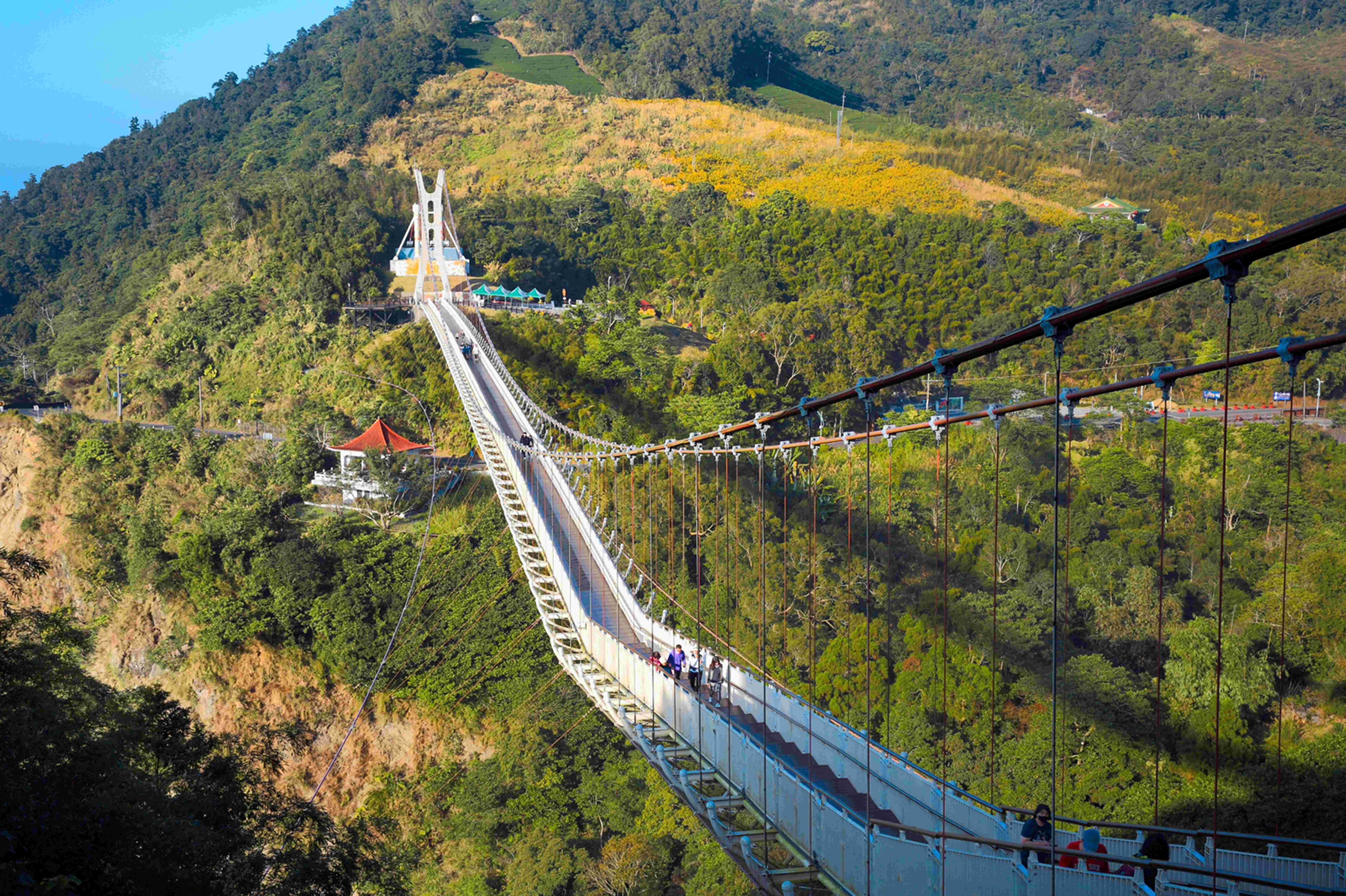 「孝子路-大巃頂步道」可以沿著階梯往上爬,山頂視野開闊,能夠俯瞰整片茶園和山景。穿過孟宗竹林的「孝子路步道」綠意盎然,中途可接上大巃頂步道,還會經過像迷你版太平雲梯的「太平吊橋」。站在吊橋上能看到縣道162甲線美麗的綠色公路,是梅山鄉的隱藏秘境。
